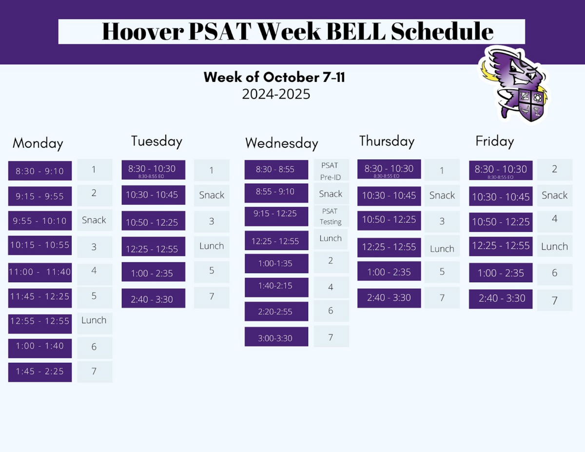 On Wednesday, our 11th grade students will take the PSAT test. We have a special schedule which is below. Good luck to our Juniors!!