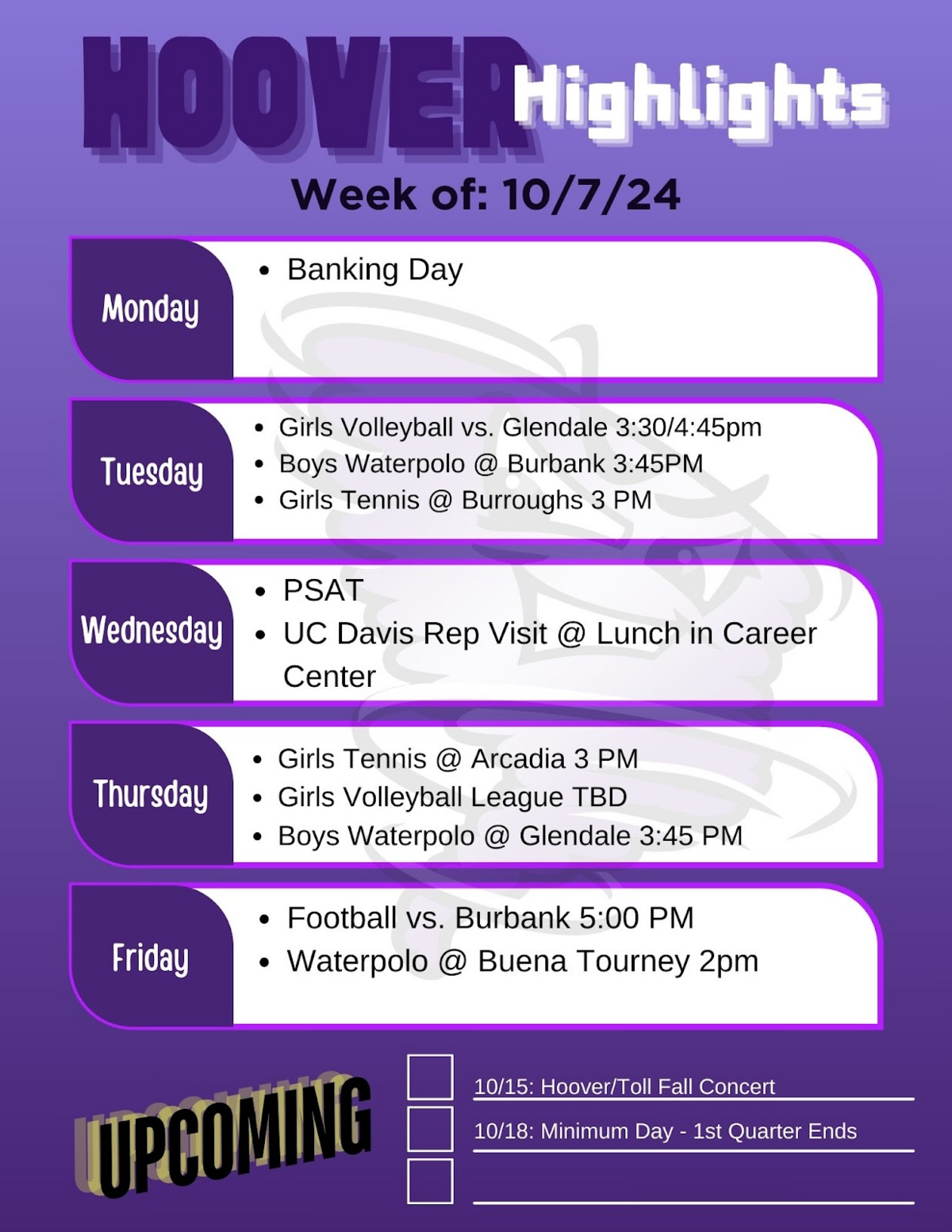 At Hoover, we continue to promote a College-Going Culture. We will be hosting more reps from various colleges and universities this week. Our 2nd annual College Week will take place November 18-22. As a reminder for Senior parents, UC and Cal State Apps are due December 2. Our counselors and college advisor are here to support all of our Seniors as they apply for college!!