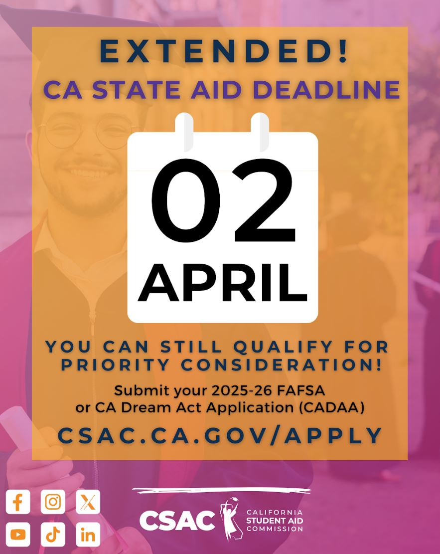 FAFSA and CADAA Deadline extended to April 2nd - Haven't started or completed your FAFSA or CADAA? You still have time! If you have not submitted a financial aid application, you have until April 2nd to submit your FAFSA or CADAA Form. Please make sure that you book an appointment with Mr. Melgar, our college adviser, ASAP to get started or complete your financial aid application. You must complete a FAFSA in order to be eligible for Cal Grant/Pell Grant, loans, and other state and federal aid. Many scholarships require proof of FAFSA/CADAA submission as well, so make sure that you submit ASAP! Schedule an appointment at https://tinyurl.com/mrmelgar. To create a FAFSA Account: https://studentaid.gov/fsa-id/create-account/launch & To create a CADAA Account: https://dream.csac.ca.gov. Not sure which one you're eligible for? Go see Mr. Melgar in the College and Career Center, Room 2101.