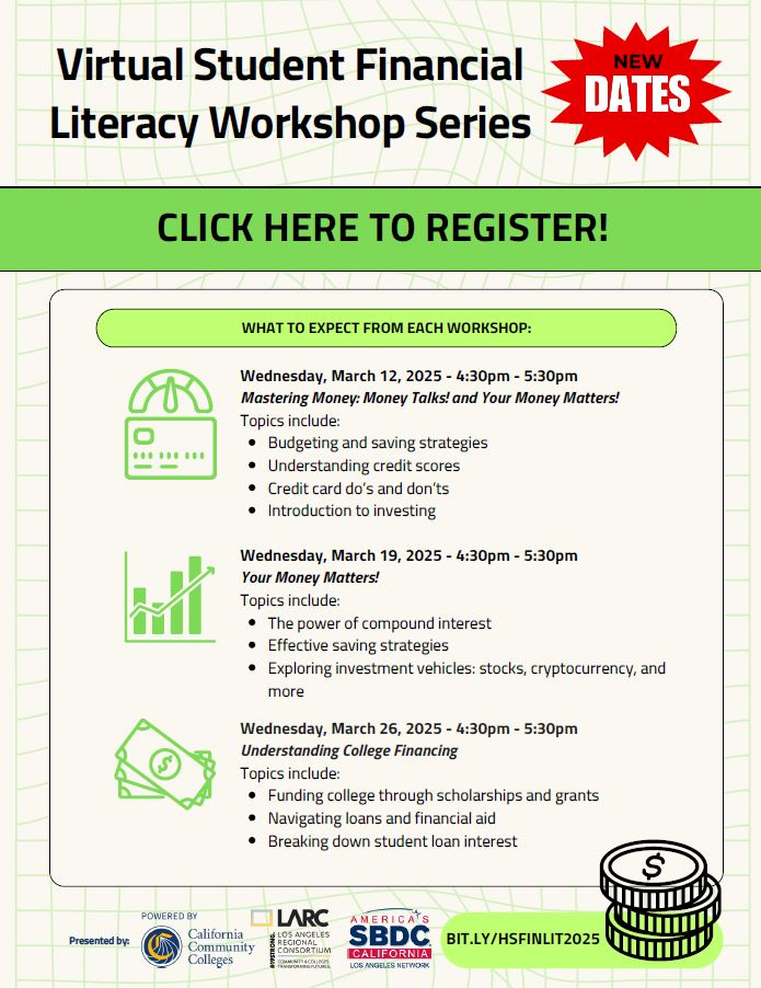 Virtual Student Financial Literacy Workshops Series - Register at: https://www.cognitoforms.com/PasadenaSBDC/LARCFinancialSkillsForHSStudentsSpring2025