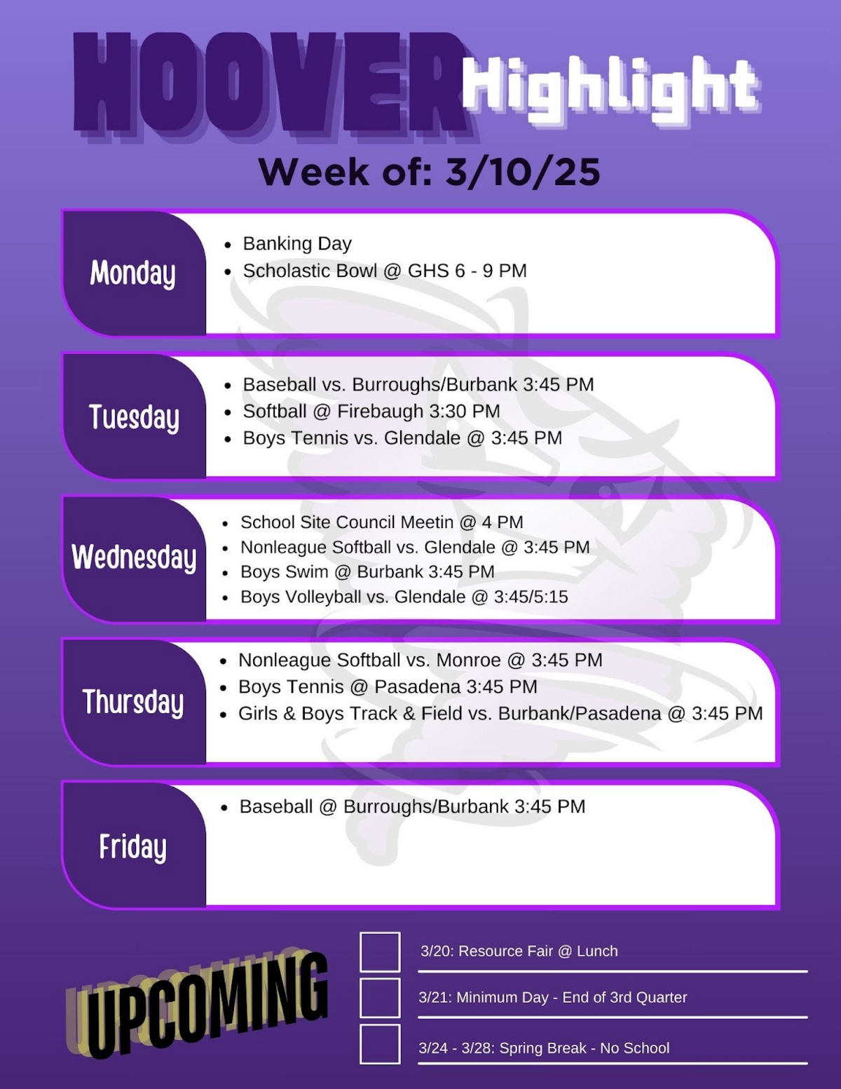 Our Spring Season is starting this week. We encourage all of our students to support our Softball, Baseball, Boys and Girls Track, Boys and Girls Swim, and Boys Tennis programs during their season. Additionally, please continue to support our Award winning Hoover Tornado Marching Band, Choir, and Pep programs as they continue to compete and represent Hoover!