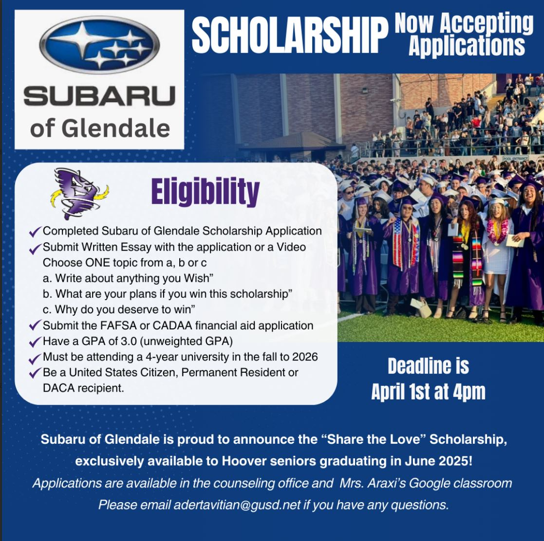 SENIORS! The Subaru scholarship is now accepting applications! See the flyer below for more information. Applications are due April 1st.