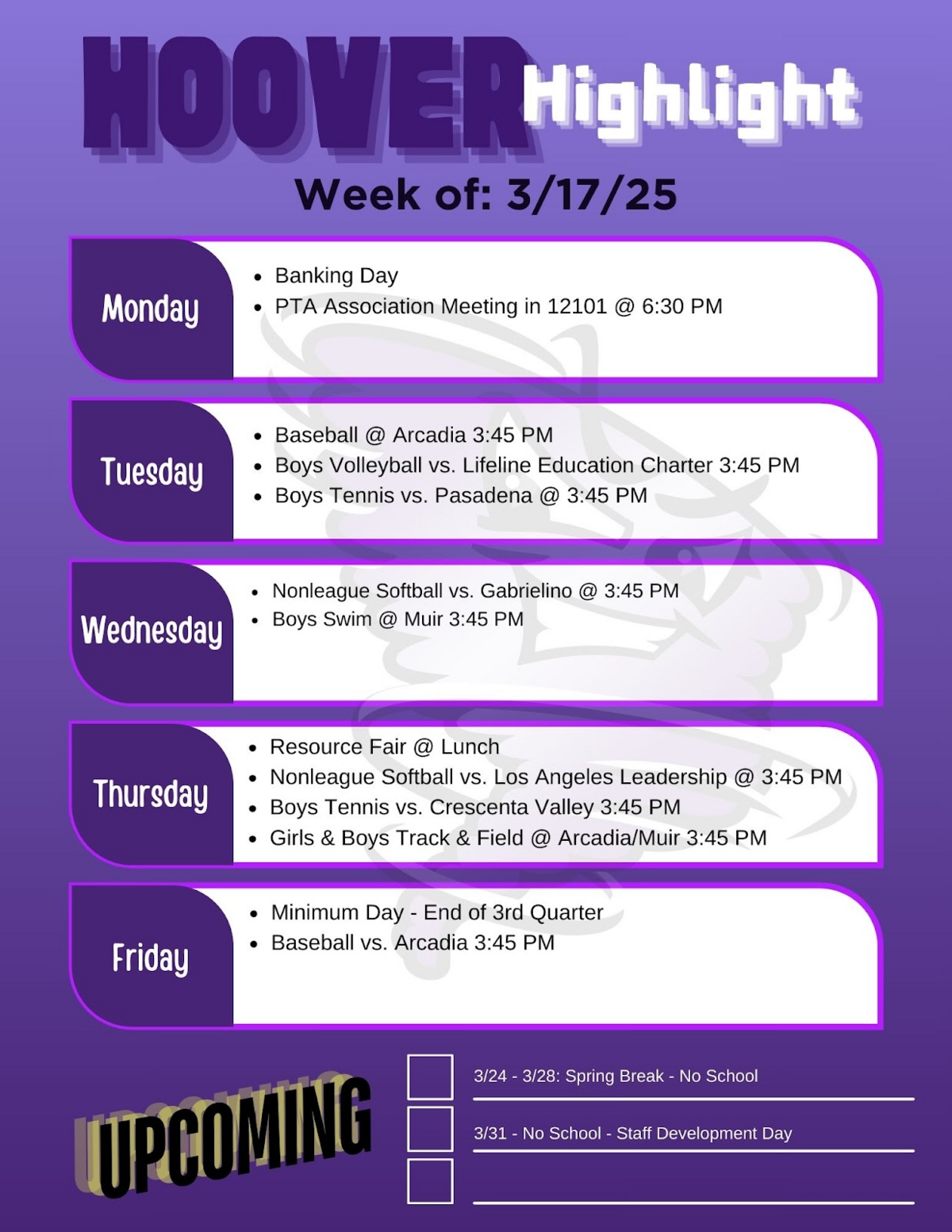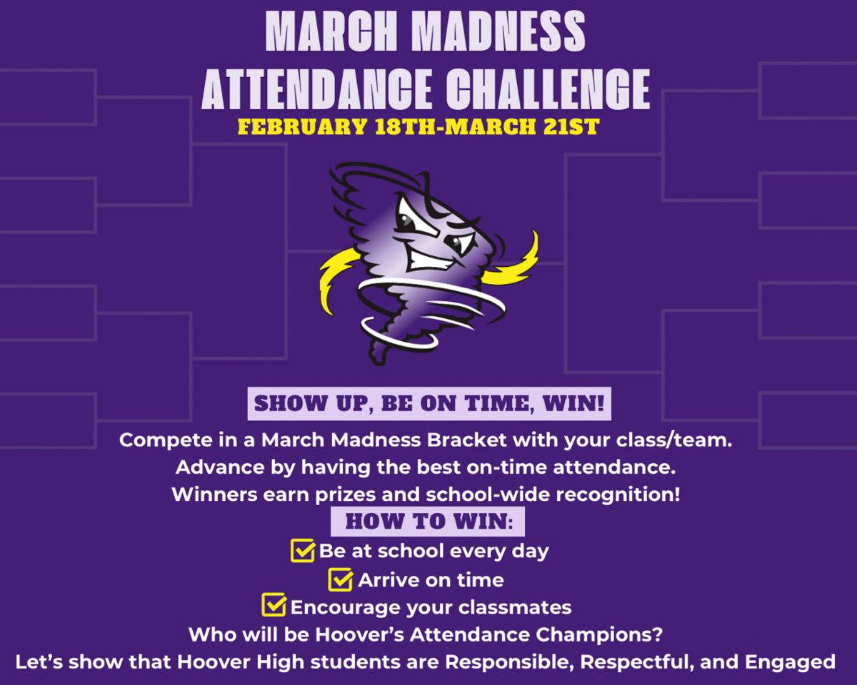 Our Spring Season is starting this week. We encourage all of our students to support our Softball, Baseball, Boys and Girls Track, Boys and Girls Swim, and Boys Tennis programs during their season. Additionally, please continue to support our Award winning Hoover Tornado Marching Band, Choir, and Pep programs as they continue to compete and represent Hoover!