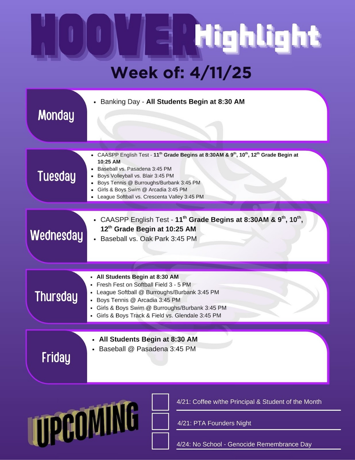 CAASPP Testing: This week, 11th grade students will finish taking the CAASPP test. Students in grades 9, 10, and 12 will start school at a later time on April 15 and 16. Please view the bell schedule included in the email.