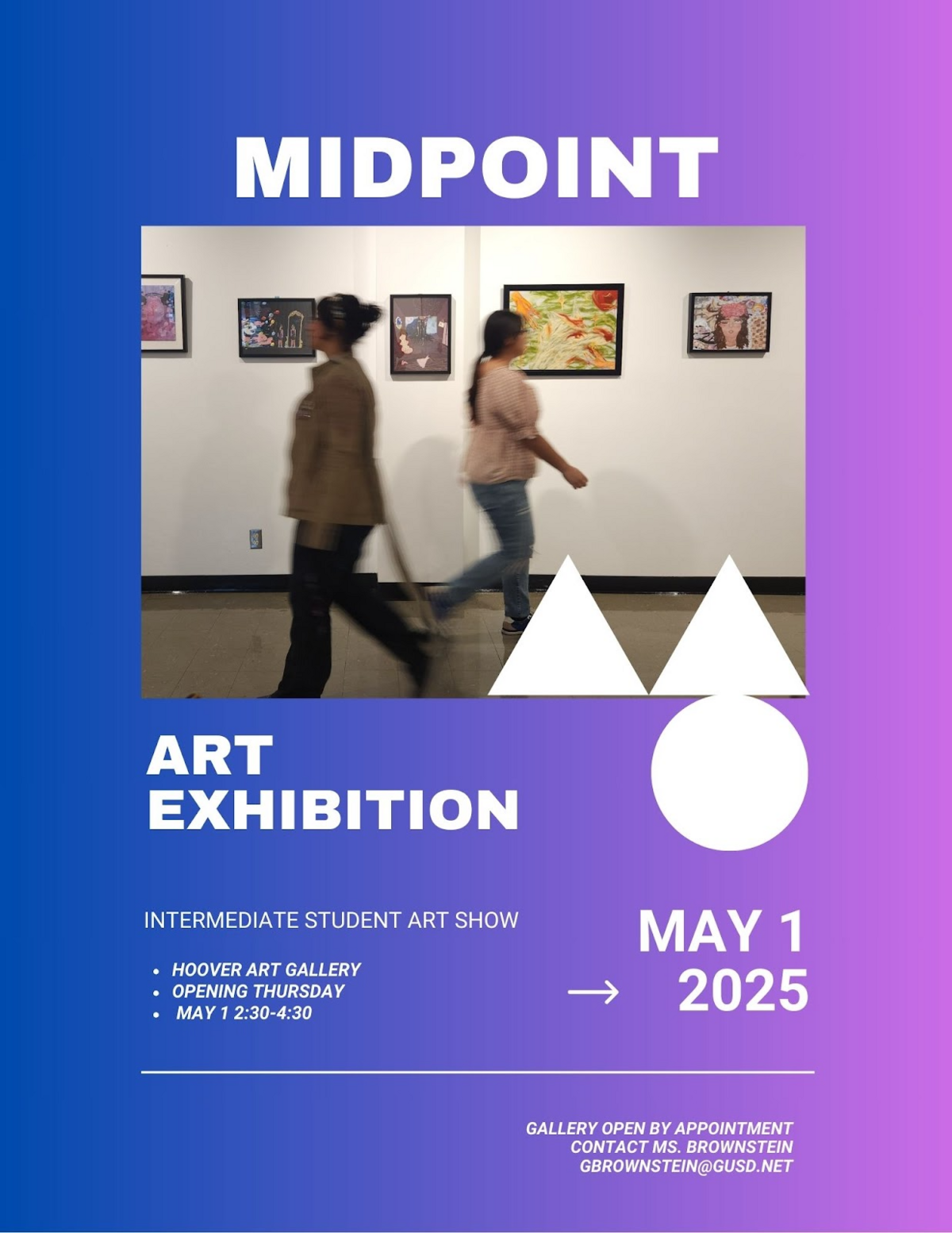 Our Intermediate Art Show will take place in the Hoover Art Gallery on Thursday, May 1. I have seen a sneak peak at some of the amazing art that will be on display! You will not want to miss this!!!