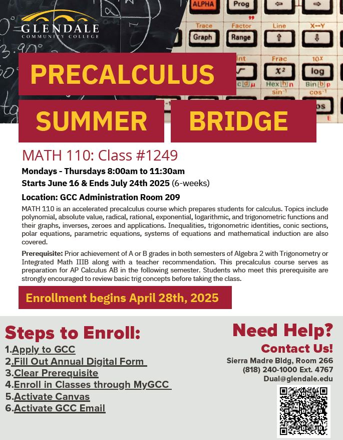 MATH 110 is an accelerated precalculus course which prepares students for calculus. Topics include polynomial, absolute value, radical, rational, exponential, logarithmic, and trigonometric functions and their graphs, inverses, zeroes and applications. Inequalities, trigonometric identities, conic sections, polar equations, parametric equations, systems of equations and mathematical induction are also covered. Please see the flyer below for more information.