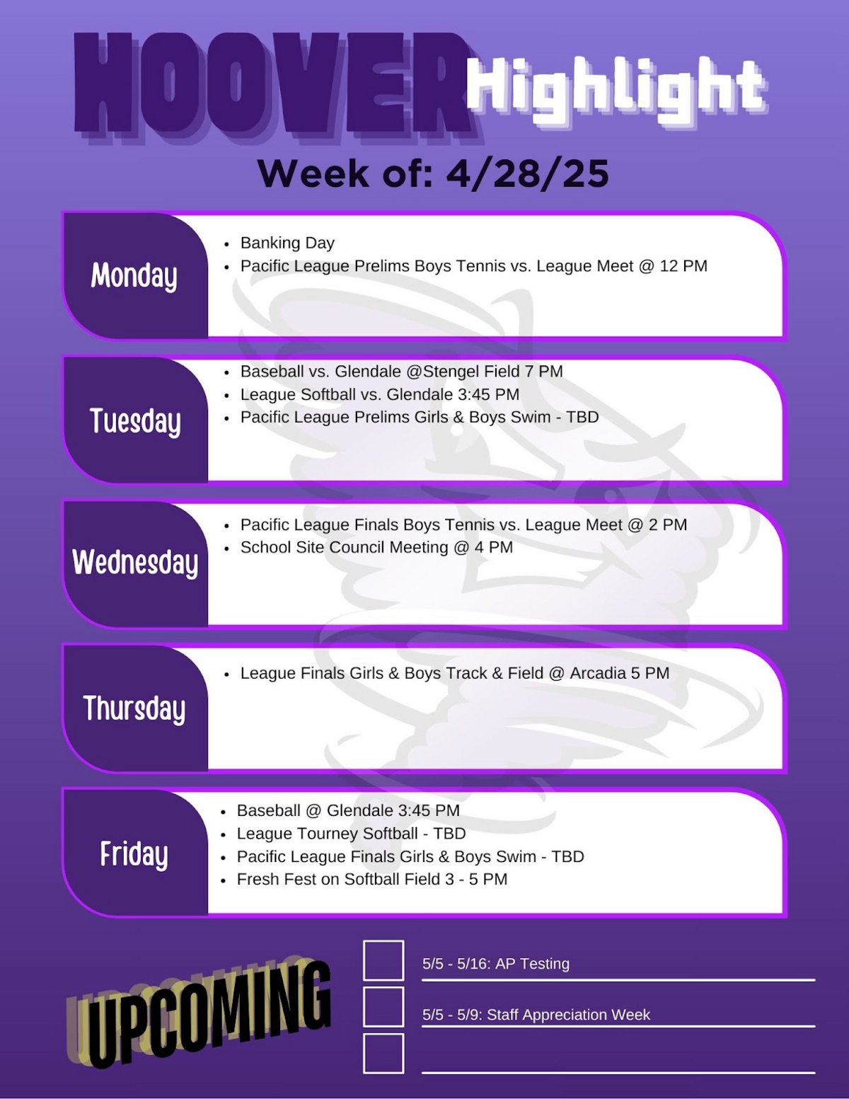 As our Spring Season comes to end, we encourage all of our students to support our Softball, Baseball, Boys and Girls Track, Boys and Girls Swim, Boys Volleyball, and Boys Tennis programs during their season. Additionally, please continue to support our Award winning Hoover Tornado Marching Band, Choir, and Pep programs as they continue to compete and represent Hoover!