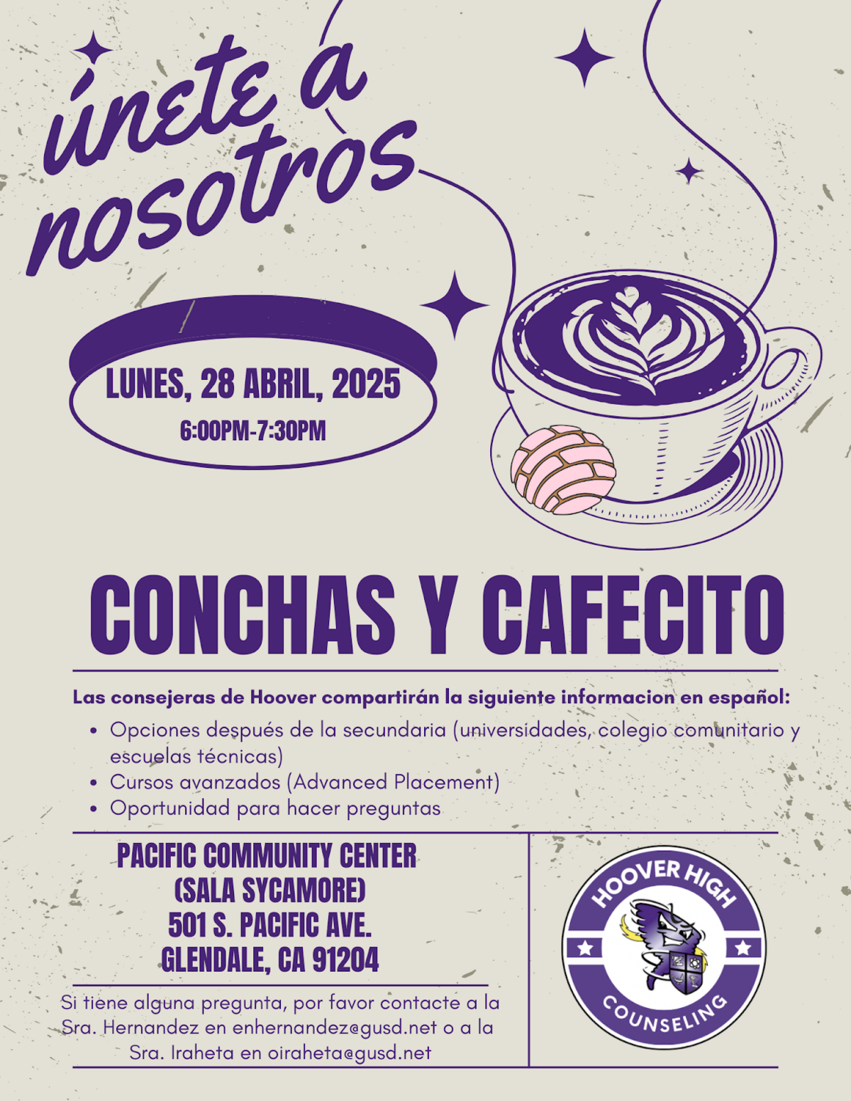 The Hoover counselors invite our Spanish Speaking families to our 2nd Conchas y Cafecito meeting—a space to connect with our Latino community and share valuable information for your child’s success. The presentation will be delivered in Spanish. We will be presenting on the difference between community college, university, and trade school as well as the benefits of Advanced courses (AP classes).