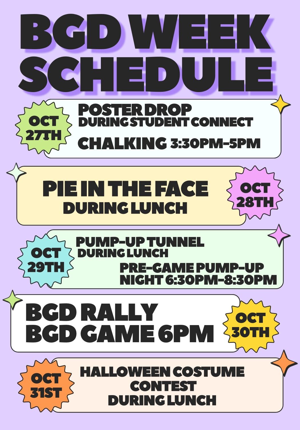 This week is our annual BGD (Beat Glendale Day) Week, kicking off with our traditional class poster drop on Monday, a night rally on Wednesday from 6:30-8:30, and our Day rally and BGD game on Thursday! Go Tornados!