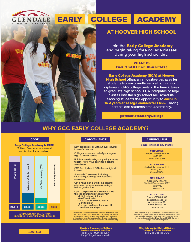 9th Grade Students - Applications for the Early College Academy (ECA) are due Thursday, February 19 at 5:00 pm! This is a great opportunity to challenge yourself & earn college credit while you’re still in high school & have it built into your school day allowing you to earn up to 2 years of college courses for FREE, saving parents & students time & money. If you have a sibling in 8th grade, encourage them to apply too, applications are open for both current 8th & 9th graders. Check out the flyer below, talk with your family, & apply if this sounds like a good fit for you!