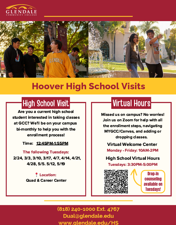 Registration continues - Counselors will be working with incoming 9th graders at the middle schools. All registration links, resources, & more are available on the Counseling Website at hooverhs.gusd.net/registration26-27.