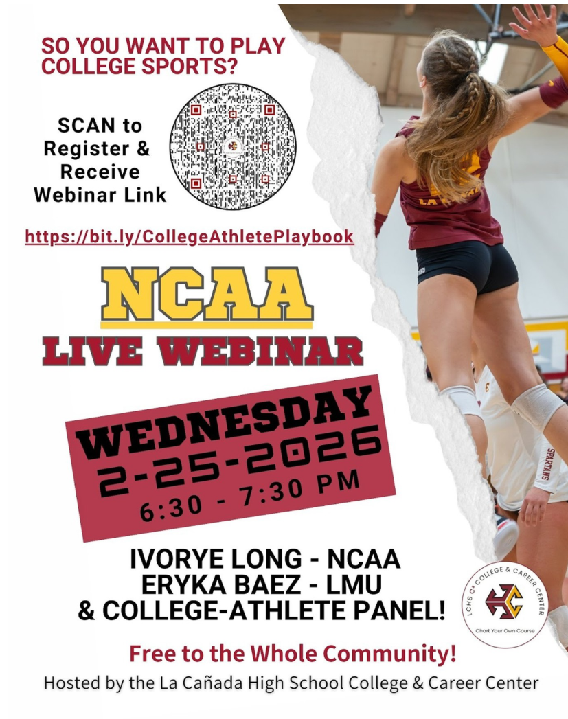 Do you have a student interested in continuing their sport at the college level? La Cañada High School is hosting a live webinar on Wednesday, February 25th, from 6:30–7:30 PM. This free community event is designed for students and families who want to learn more about playing sports in college. The webinar will feature Ivorye Long from the NCAA, Eryka Baez from LMU Athletics, and a panel of college-bound student-athletes sharing their experiences and advice. To attend, simply register at bit.ly/CollegeAthletePlaybook to receive the webinar link. For additional details, please see the flyer below. If you have any questions, please feel free to reach out to kproctor@lcusd.net.