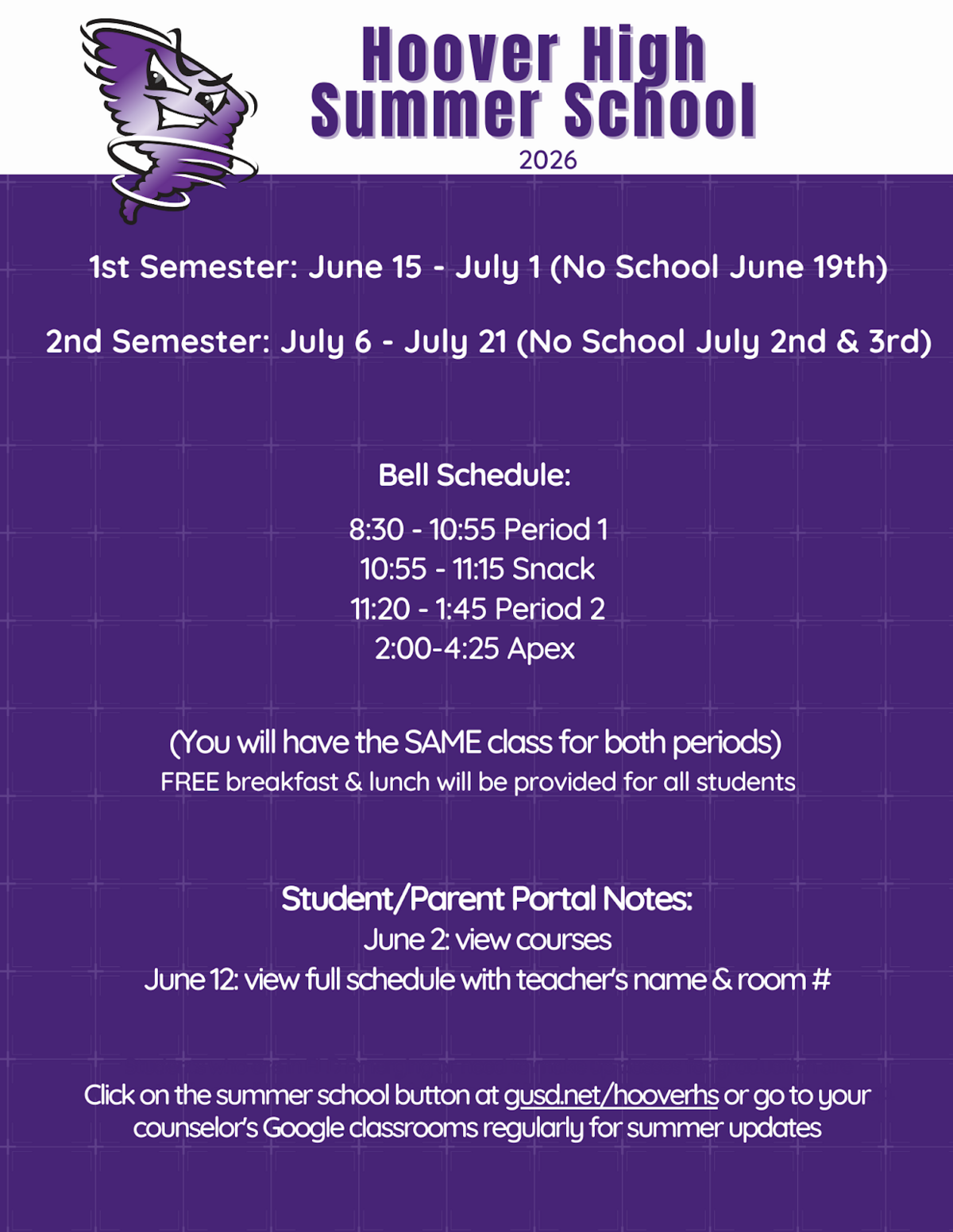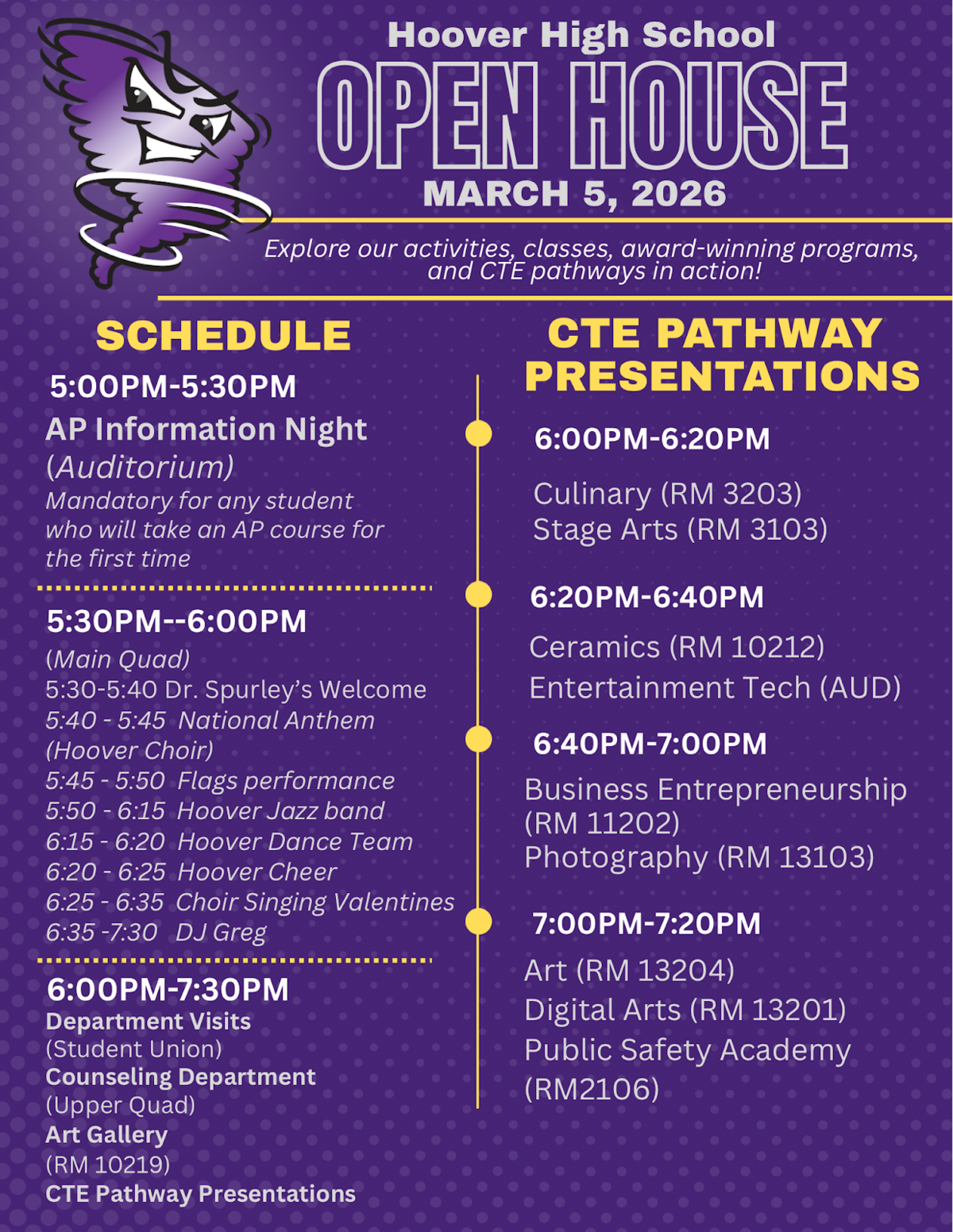 Hoover’s Open House, Hoover is Home is on March 5, 2026, beginning at 5:30 pm. Just a reminder that all students who plan to take an AP class for the first time must attend AP Information Parent Night at 5:00 pm in the auditorium before Open House. Please see the flyer included in this email for more details.