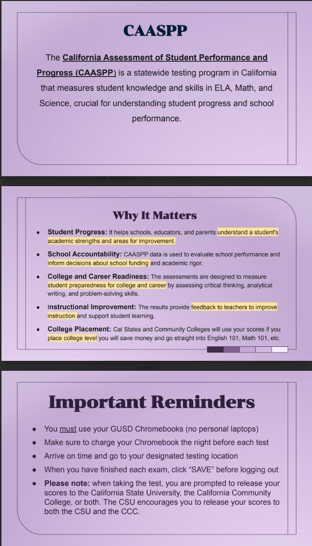 CAASPP Testing: Over the next couple of weeks, 11th grade students will be taking the CAASPP test. Please see the reminders below for more information about what the CAASPP test is, why it matters, and some important reminders! Please Note: Grades 9, 10, and 12 will not be participating. These grade level students will start school at a later time on April 7 - 9 and April 15 and 16. Please view the bell schedule below.