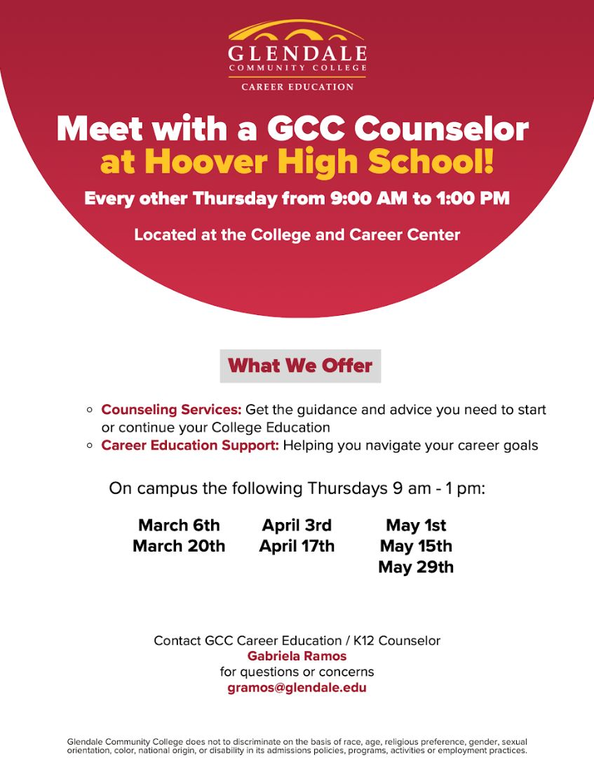 GCC is on campus every Tuesday at lunch outside the College & Career Center, Room 2101: Get answers to many of your questions on Dual Enrollment, ECA, certificate programs, important dates, enrollment steps, online application, etc. Go to glendale.edu/hs to learn more.