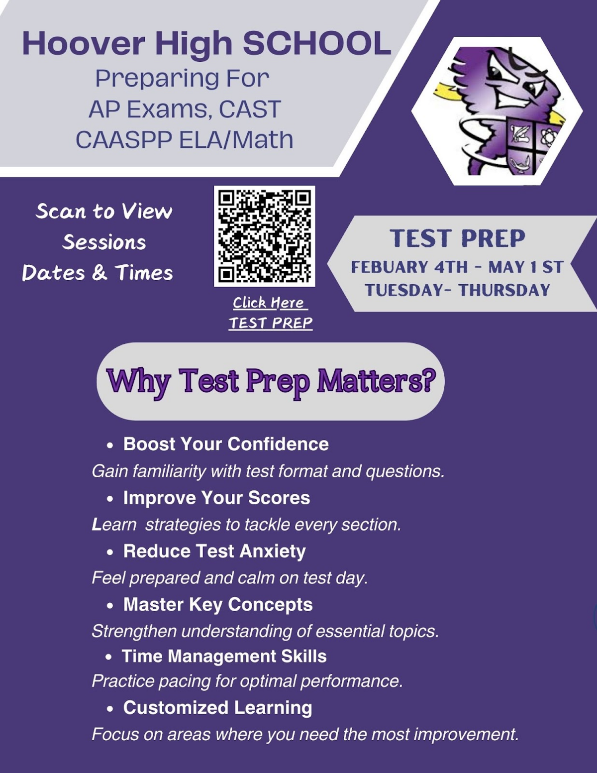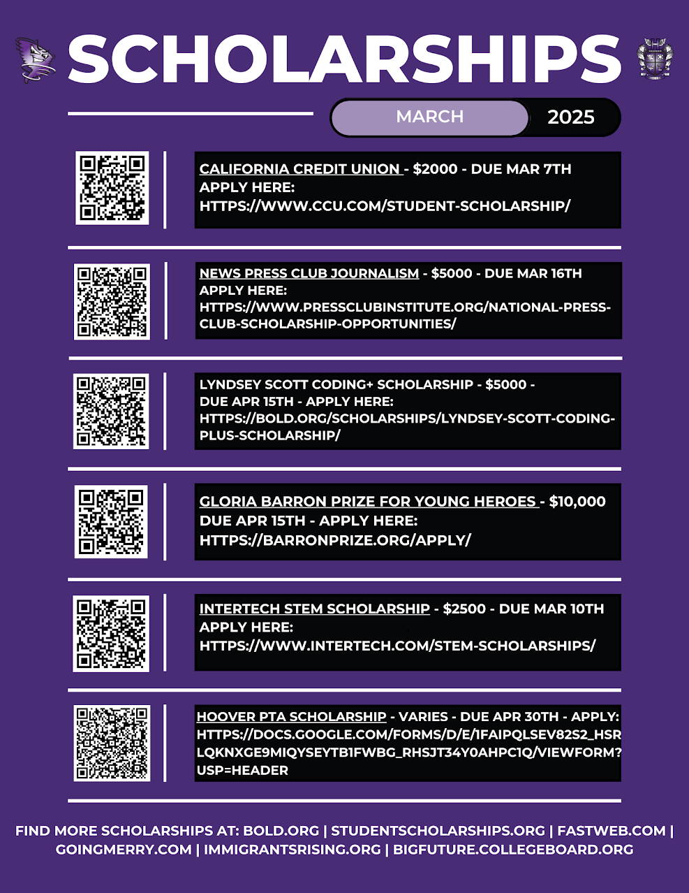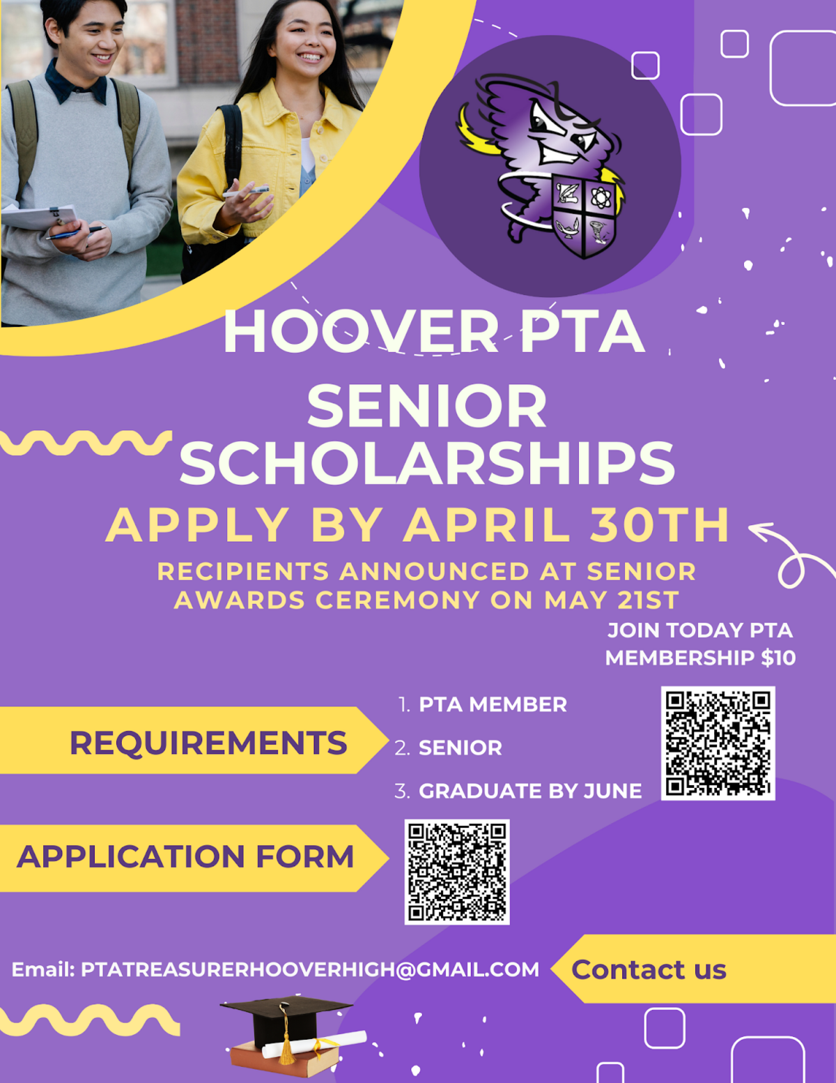 Attention Seniors! The Hoover PTA Senior Scholarships application is now open! 📆 Deadline: Apply by April 30th. 📣 Recipients Announced: Senior Awards Ceremony on May 21st. 📌 See flyer for more details. ✨ How to Apply: Scan the QR code in the flyer below or email them at PTATreasurerHooverHigh@gmail.com for more details. 💡 Don’t miss this chance to get recognized and supported for all your hard work!