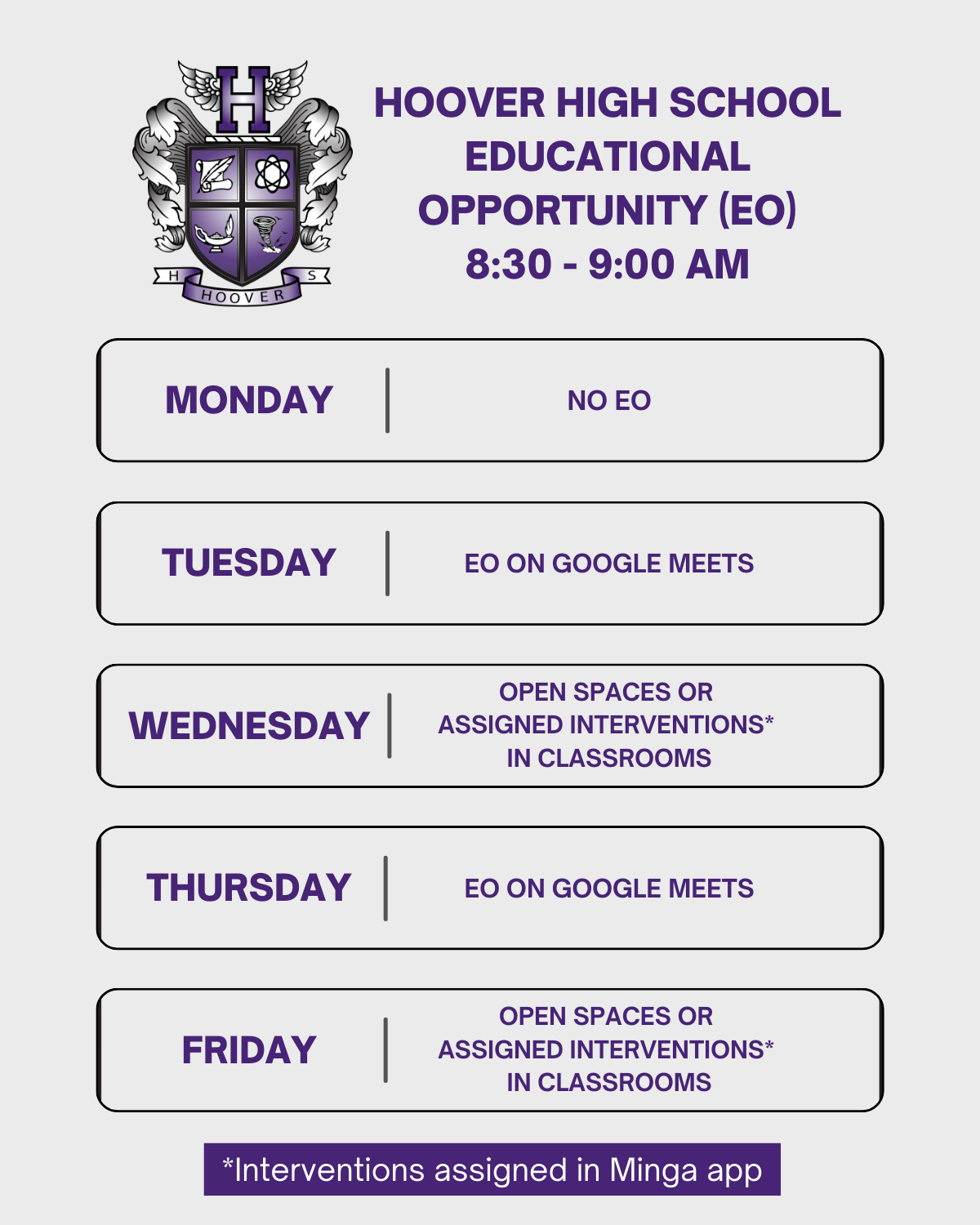 Wednesday/Friday EO: 10-week grades (3rd Quarter) have been released. This means that your EO location may have changed. Be sure to check your Minga to find out where to go for EO time on Wednesdays and Fridays.
