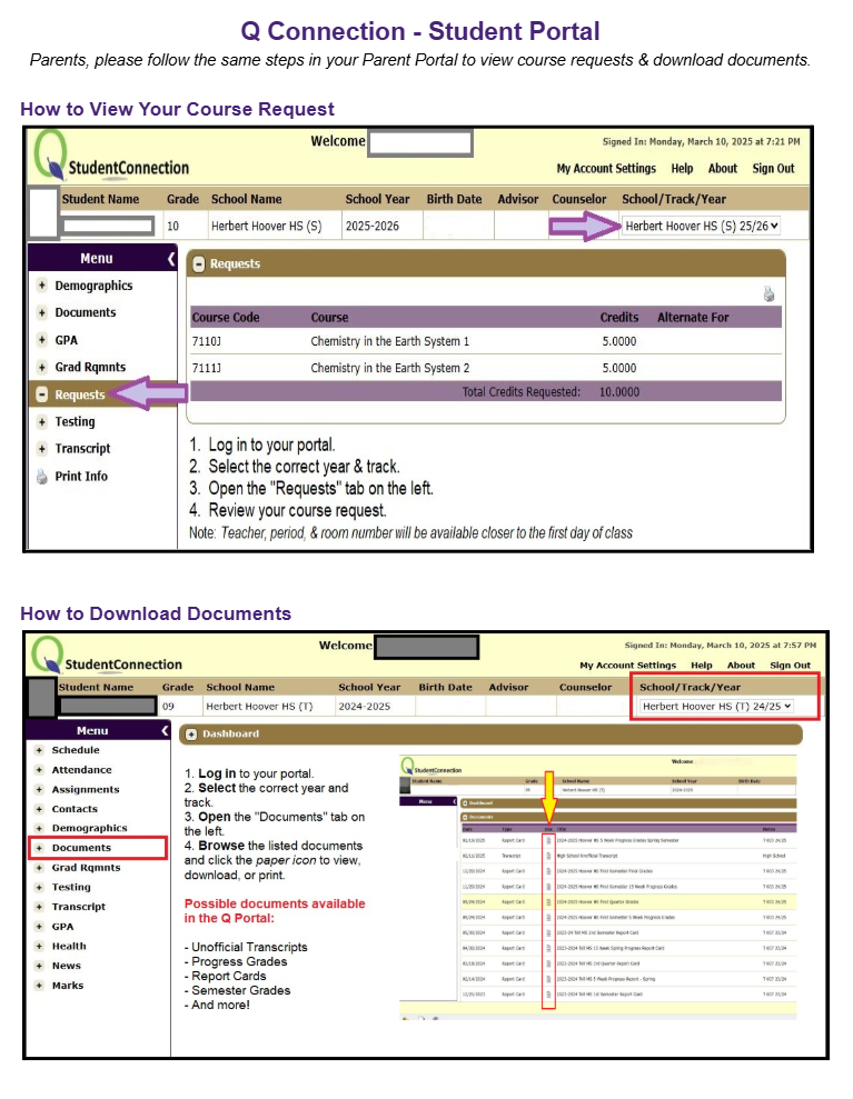 Q Connection & Student/Parent Portal: Download Important Documents - Need access to your transcripts, progress reports, semester report cards, and more? You can download them anytime through your Student or Parent Portal. Please see the flyer below for step-by-step instructions.