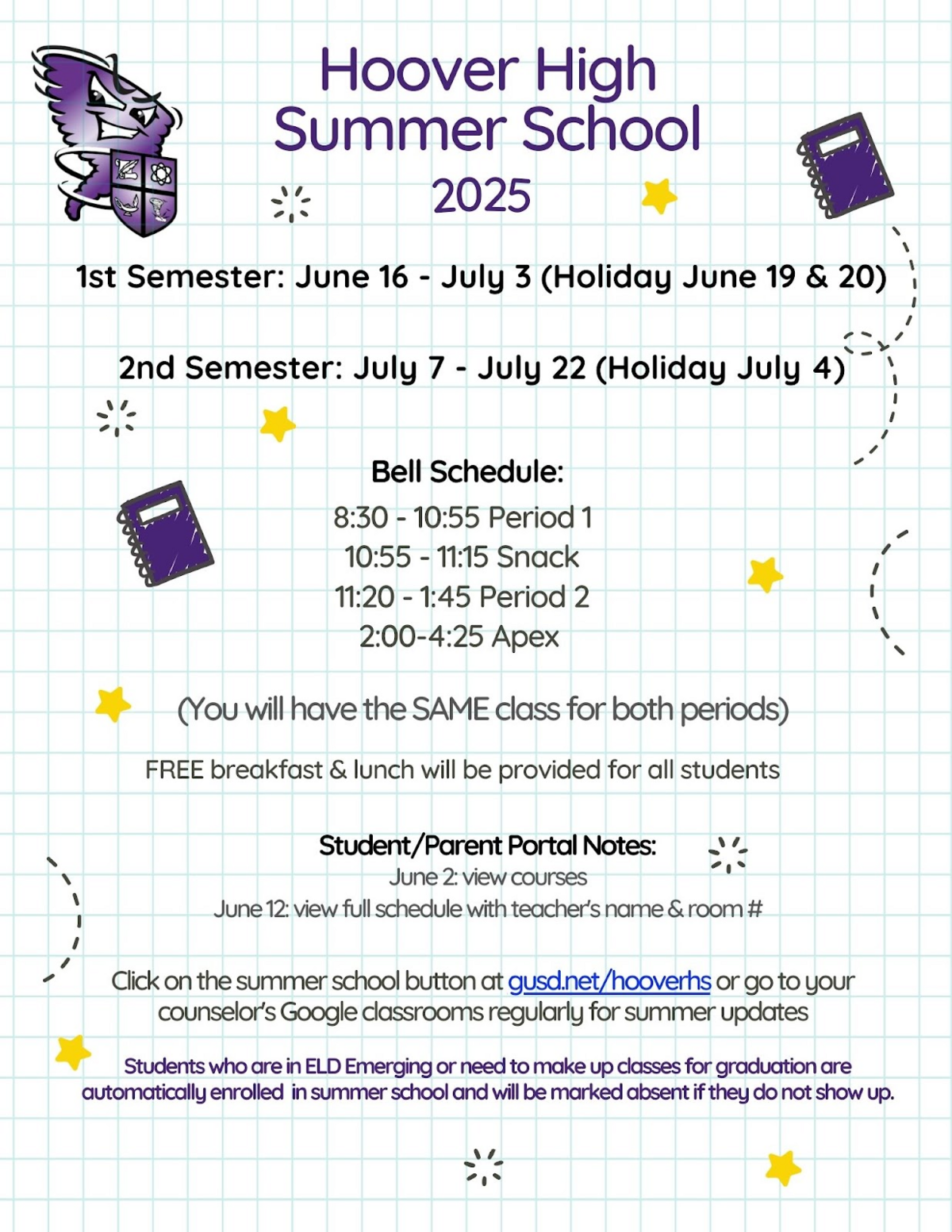 Summer School 2025 - Double Check Your Enrollment regularly! Counselors automatically enroll students in summer if they earned an “F” grade in a graduation required class. In addition, ELD Emerging students are also automatically enrolled in either an ELD or English class. Our goal is to ensure that students earn their high school diploma and graduate with their class on time! To check your summer school schedule, log in to your Student or Parent Portal. Follow the instructions on the flyer below.