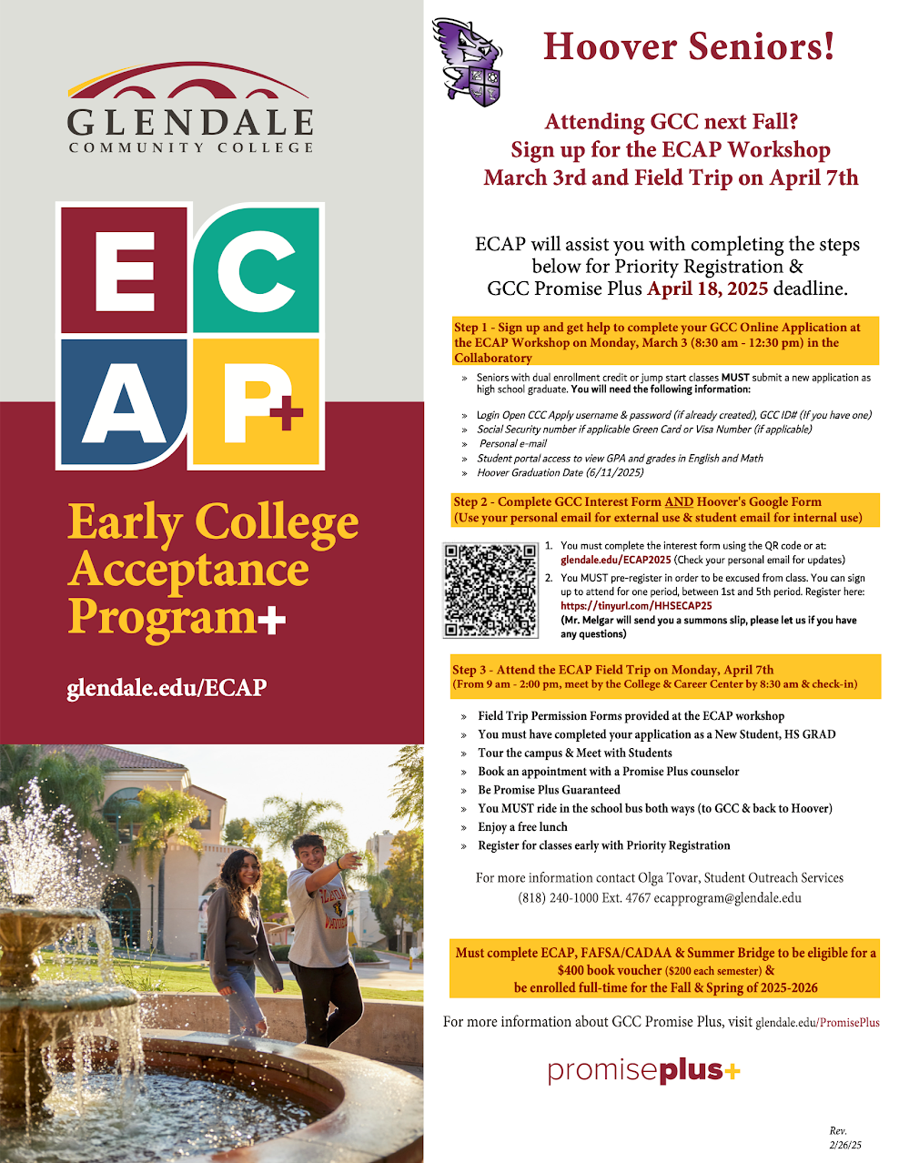 Attention Seniors! The ECAP field trip to GCC is tomorrow, Monday, April 7th. If you signed up and returned your permission slip, please make sure to check your email for details. If you are interested in going, there is still room for the April 14th ECAP field trip. Be sure to see Mrs. Araxi or Mr. Melgar to get a spot.