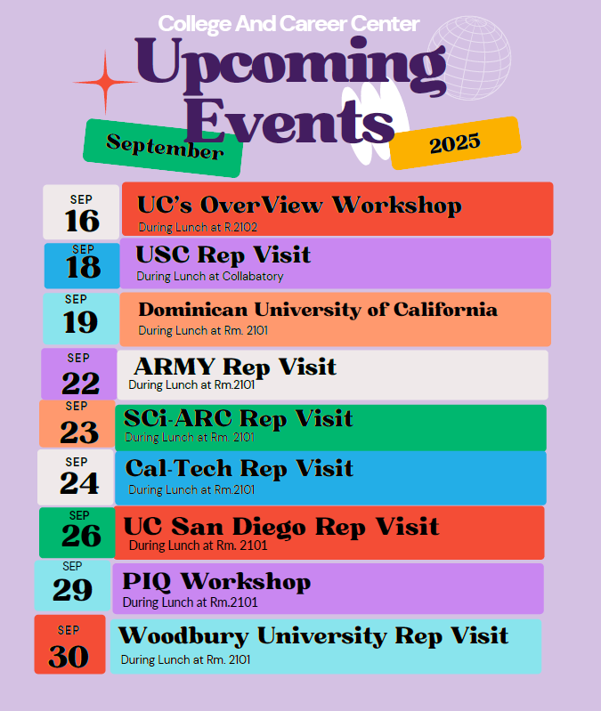 College and career fairs are valuable opportunities for students to explore their future options. These events bring together representatives from colleges, universities, training programs, and various industries to share information about admissions, programs, careers, and pathways. Students can ask questions, gather resources, and make connections that help them plan for life after high school, whether that’s pursuing higher education, entering the workforce, or both. There are several upcoming College and Career Fairs open to all grade levels. Registration is recommended for easier communication with college representatives.